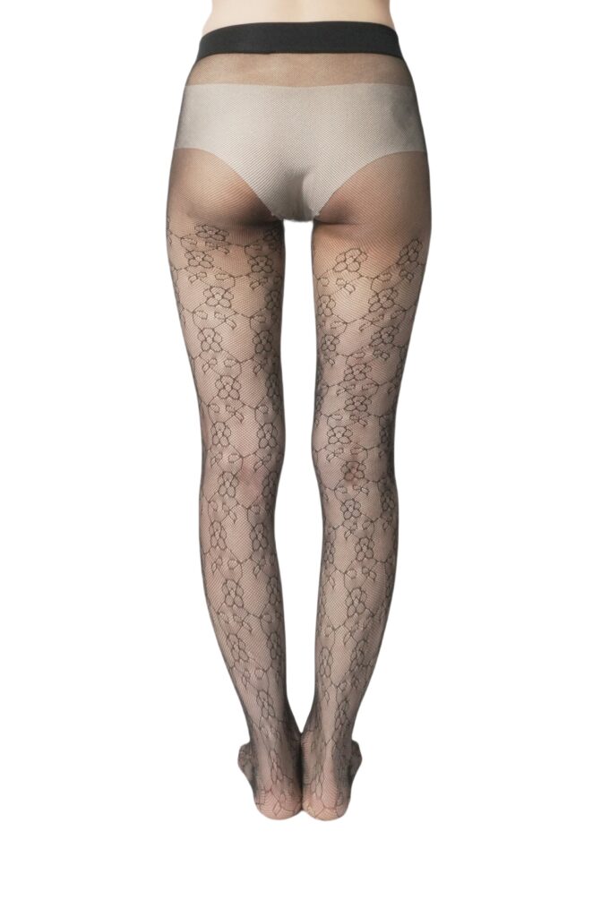 Women’s sheer black tights with a subtle micro-mesh and all-over delicate floral jacquard pattern.