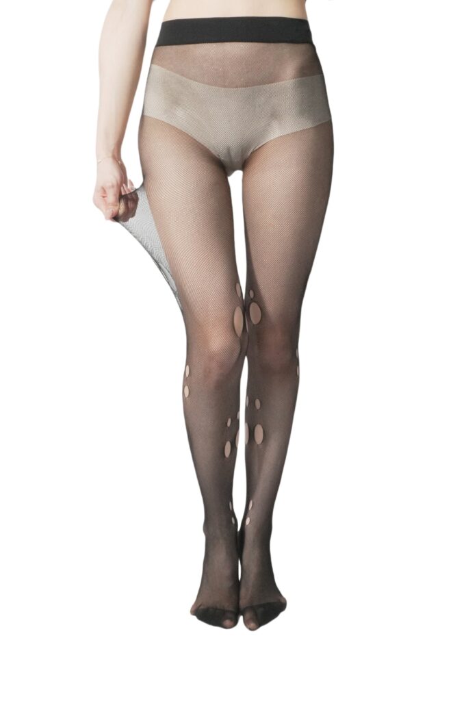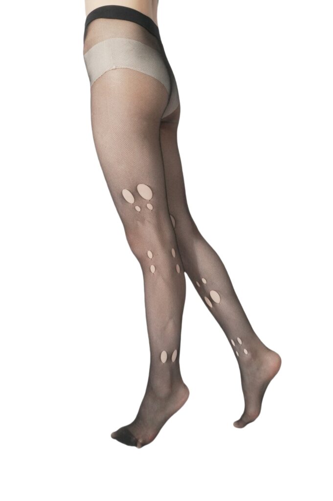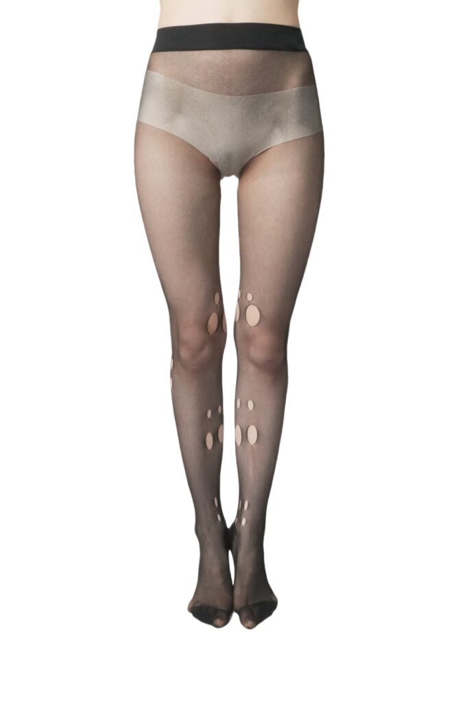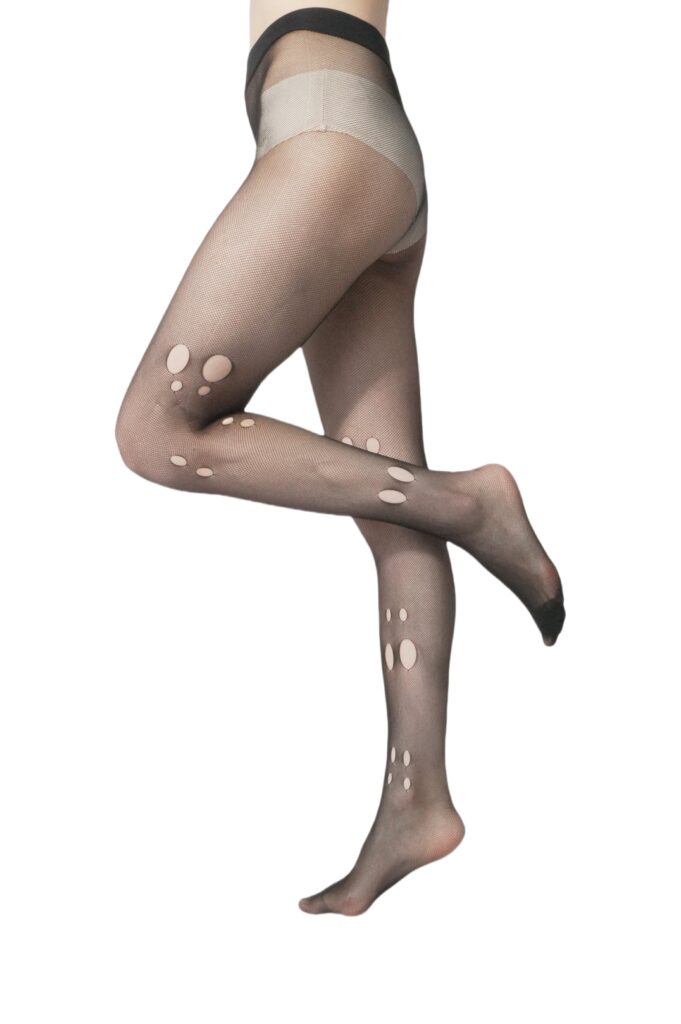 These fashion fishnet tights combine modern creativity with wearable comfort, delivering a bold statement for trend-focused hosiery collections. Designed with an ultra-fine mesh base, these sheer patterned tights feature strategically placed artistic cut-out details along the legs, creating a distinctive visual effect that blends edgy styling with contemporary elegance.