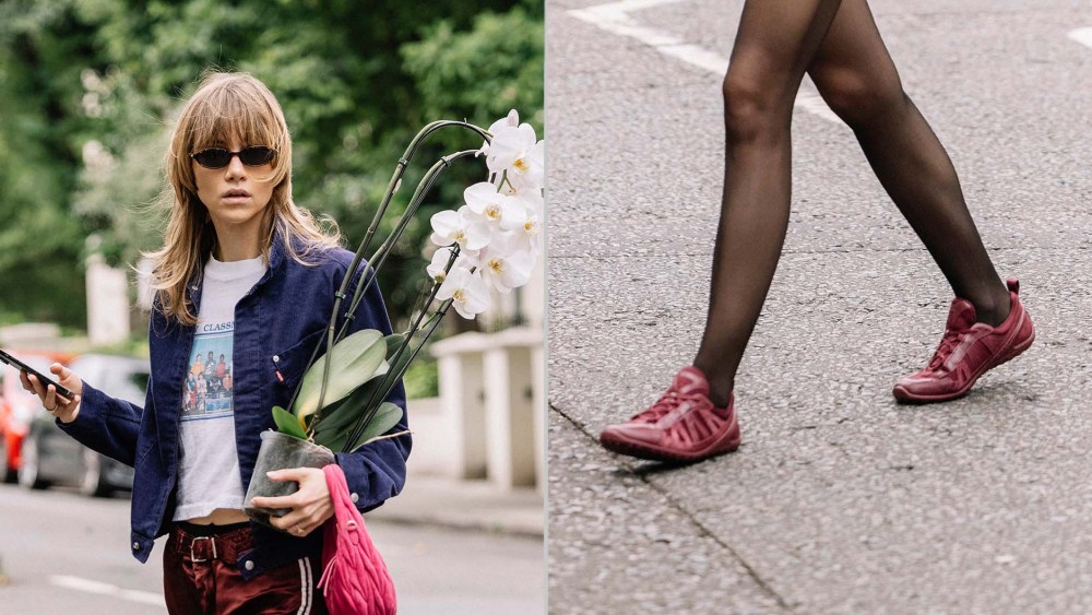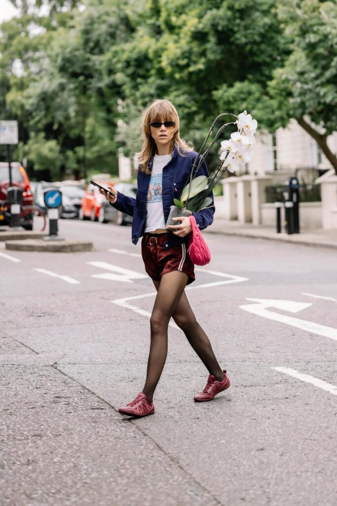 The singer and actor styled the deep red sneakers with sheer black tights, glossy burgundy running shorts with white piping, a graphic tee, and a navy twill jacket. This tights-and-shorts combo echoed vintage gym uniforms and retro track looks from the late ’80s and early ’90s. Meanwhile, Ecco’s minimalist sneakers grounded the outfit with a modern edge. To finish the look, Waterhouse added a vivid pink ruched shoulder bag and black rectangular sunglasses.